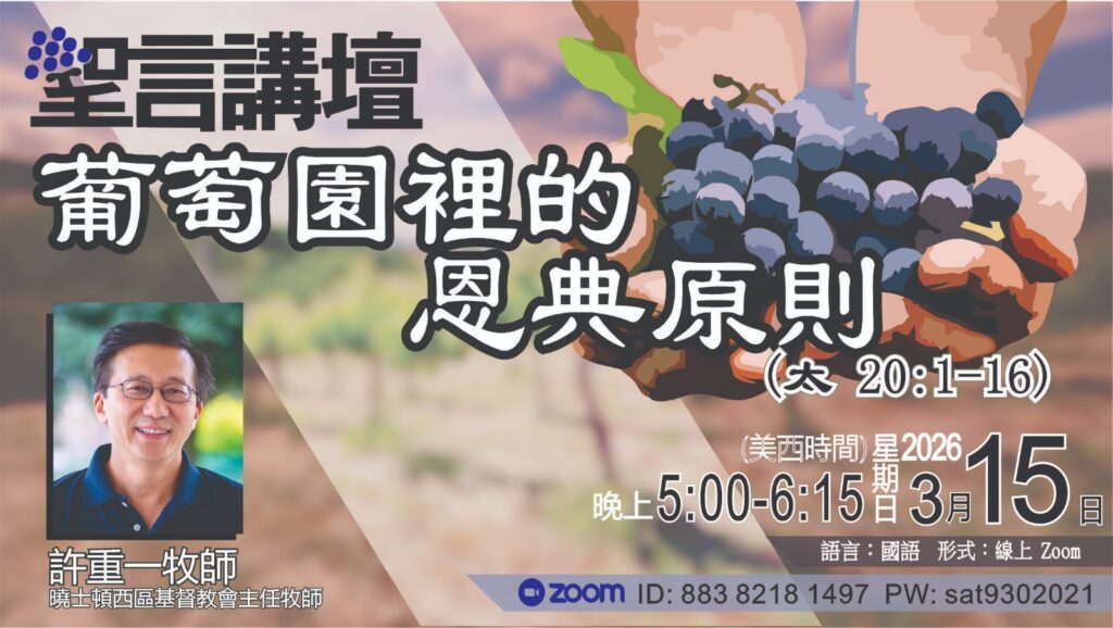 教牧學博士班課程(DMin):明年1月將開辦的「教牧學博士班」課程(主修釋經講道),已有14位同道、同學報讀。明年二月23-27日將開始第一門課:「工人的靈命、品格與領導力」,將在北加州的「曠野小棧」營地實體進行。由賴若瀚牧師、程陽杰長老任教。